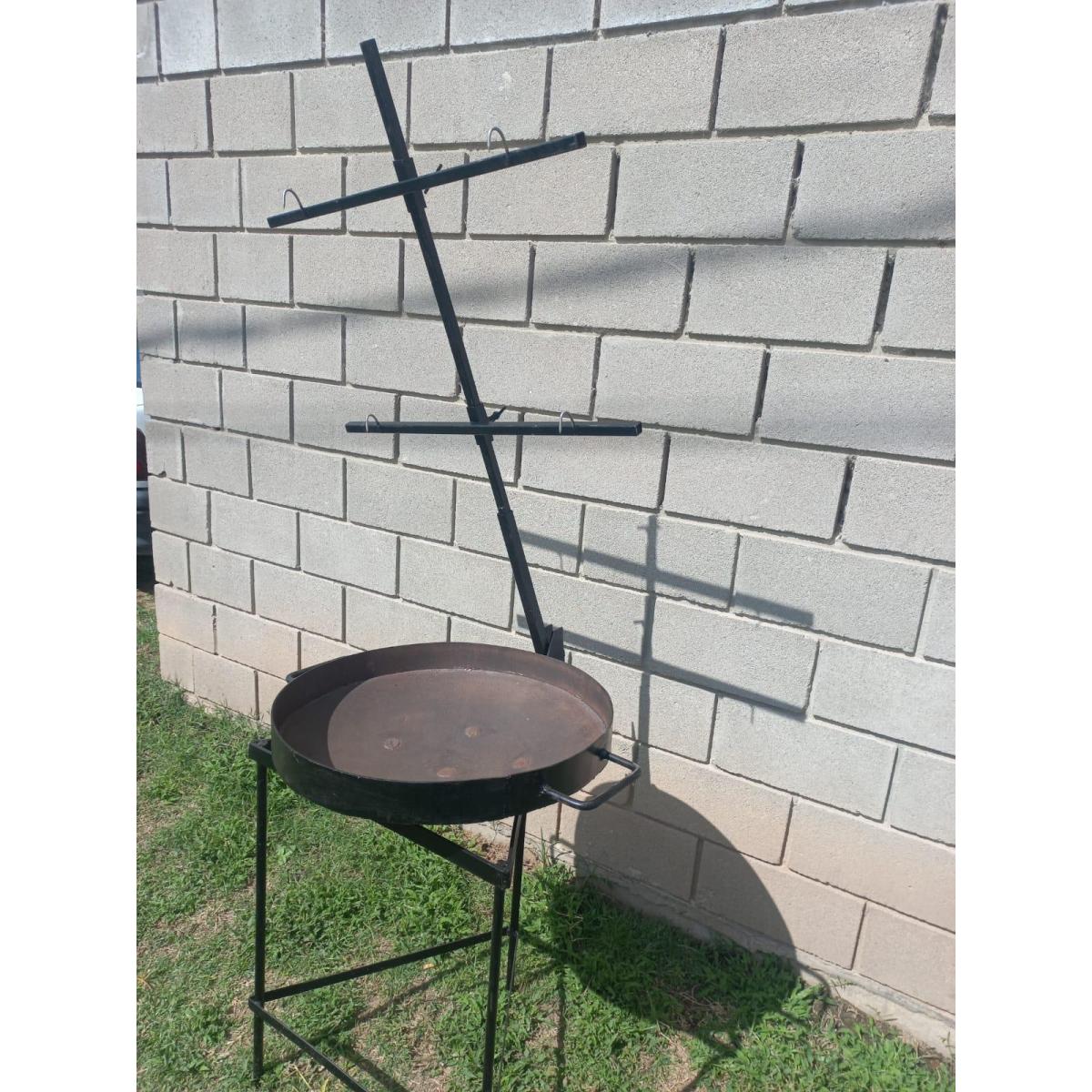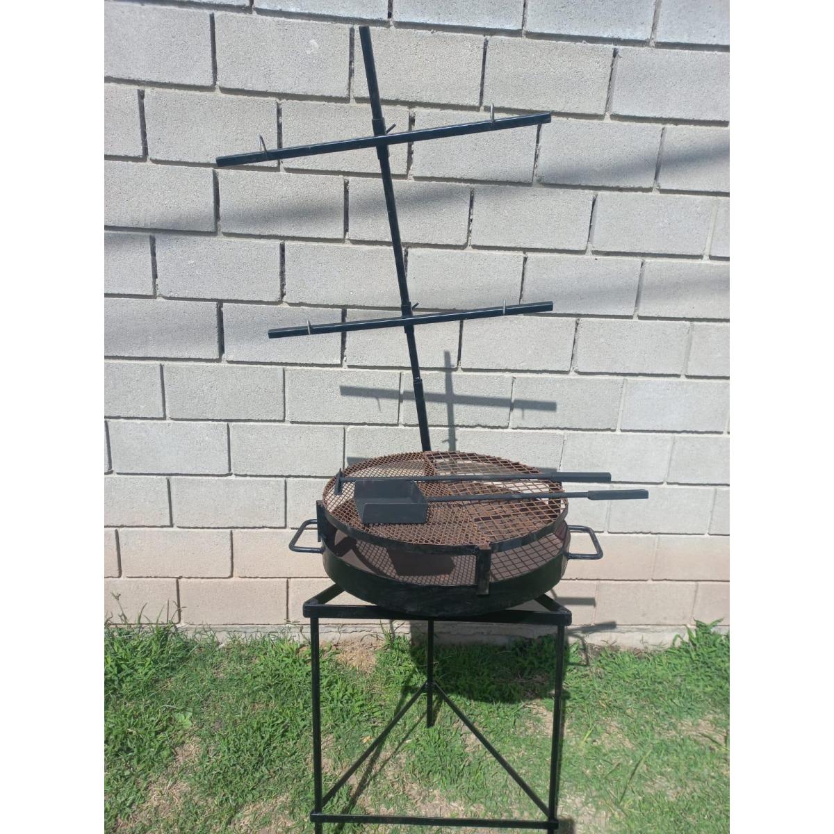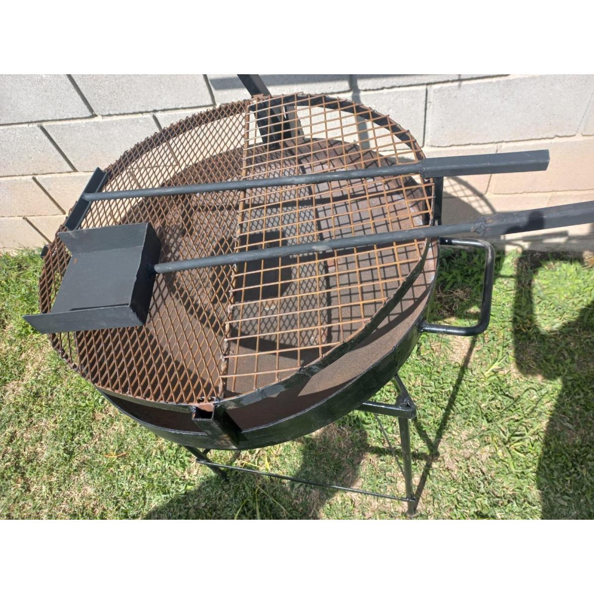 Fogonero hecho con disco de arado. Incluye parrilla removible, estaca regulable, atizador y palita. Todo nuevo. Base triangular de 90 cm, diámetro 60 cm. Su consulta no molesta.
